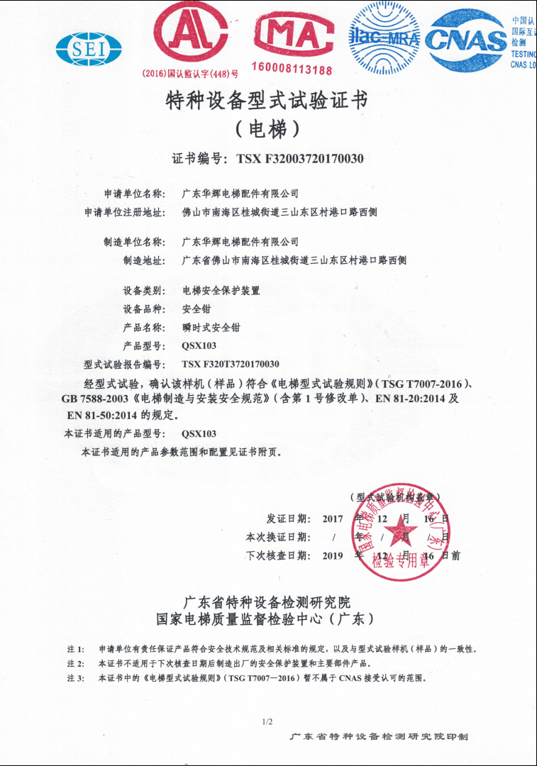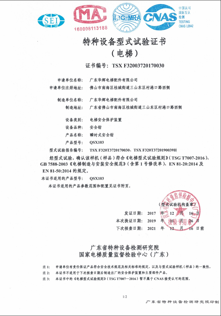 2017 issuance QSX103 certificate No.:TSX F32003720170030