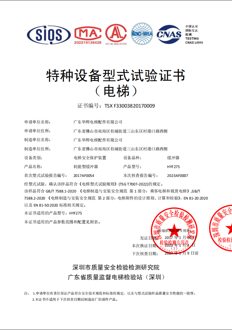 2017 issuance HYF275 Shenzhen certificate No.:TSX F33003820170009