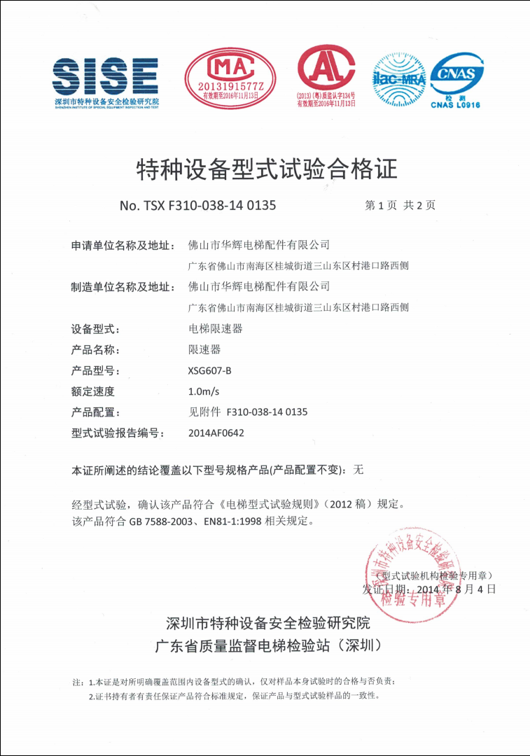 XSG607-B test certificate