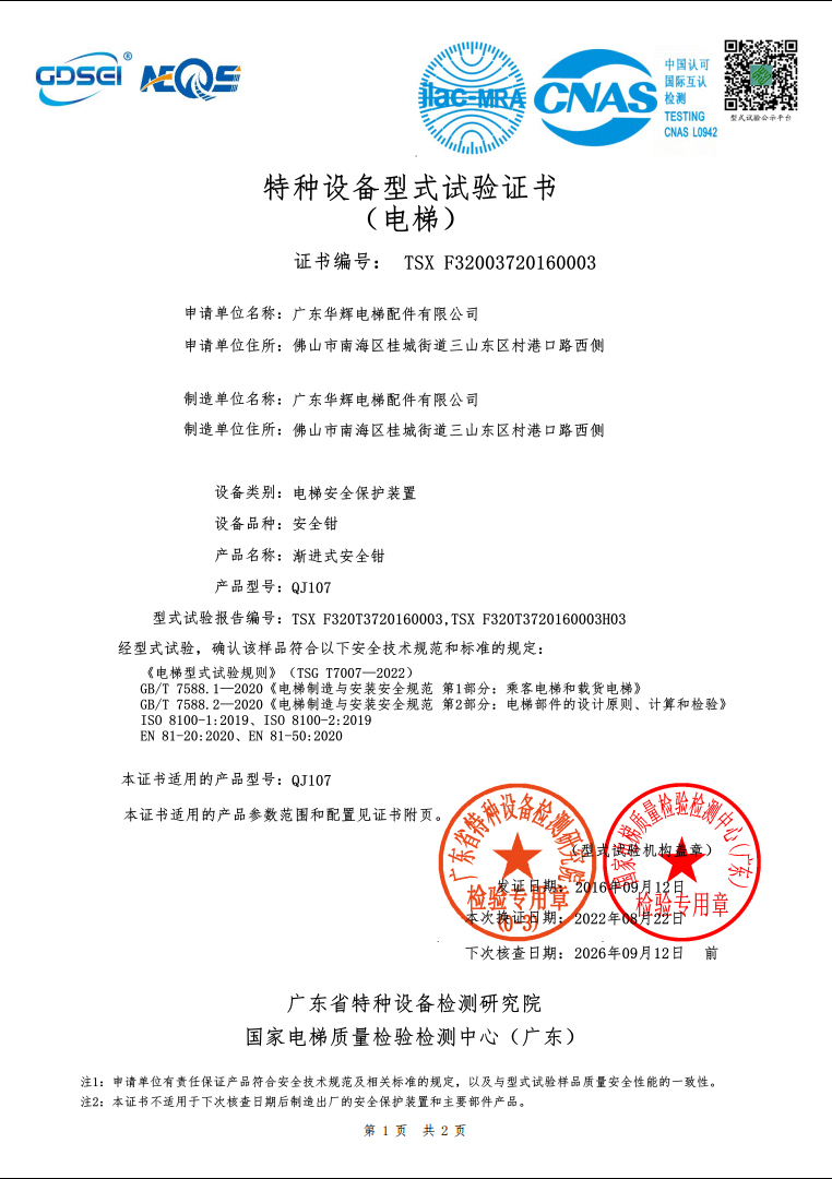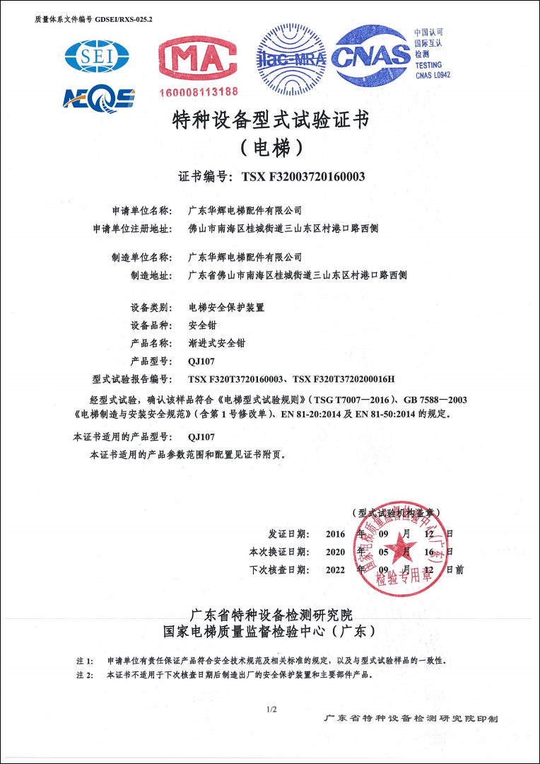 2016 issuance QJ107 certificate No.:TSX F32003720160003(Third,New standards)