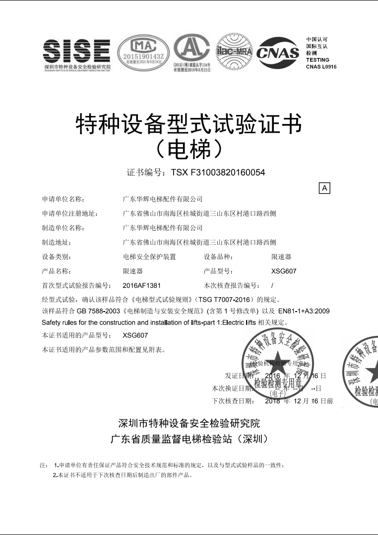 XSG607-B test certificate